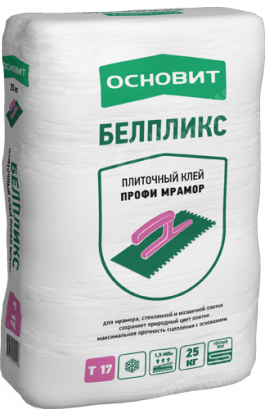 Плиточный клей ОСНОВИТ БЕЛПЛИКС Т-17 предназначен для облицовки стен и пола плитами из мрамора, цветной и прозрачной стеклянной плиткой, декоративной мозаикой, гранитом, натуральным и искусственным камнем. Используется для облицовки искусственных водоемов, чаш бассейнов, каминов. Рекомендуется для облицовки балконов, террас, цоколей, фасадов, полов с подогревом. Для внутренних и наружных работ.